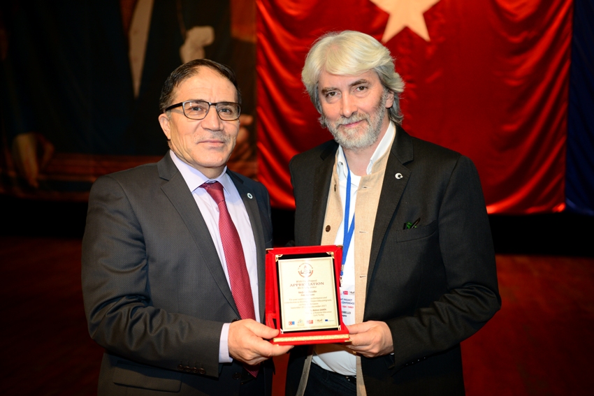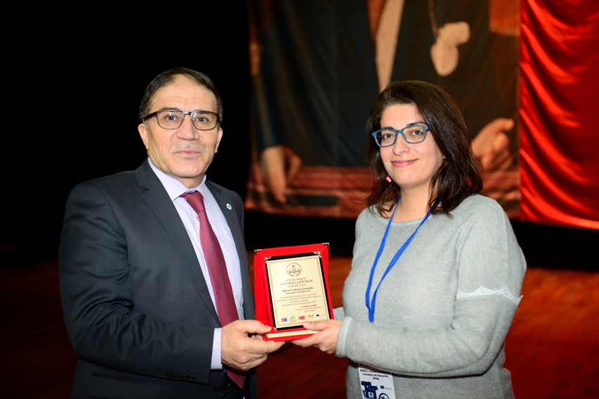 “Göçmen ve Mülteci Öğrenciler İçin Eğitimde Dengenin Sağlanması” adlı uluslararası projenin kapanış toplantısının sonunda Rektör Vekilimiz Prof. Dr. Sayın Dalkıran, projeye katkıda bulunan uluslararası kuruluşların temsilcilerine teşekkür plaketi verdi.