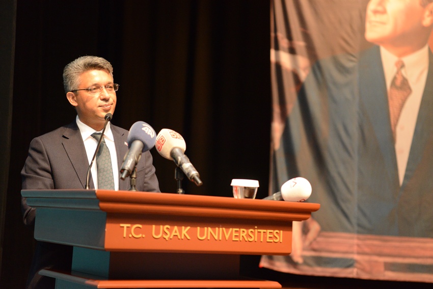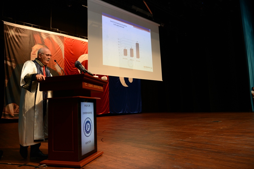 Rektör Prof. Dr. Ekrem Savaş törende gerçekleştirdiği konuşmasında, "Uşak Üniversitesi bugün, 12 fakülte, 3 Enstitü, 3 Yüksekokul, 11 Meslek Yüksekokulu, 27 araştırma ve uygulama merkezi, 195 program, 701 akademik, 330 idari personel ve 59 ülkeden 2590 yabancı öğrenci olmak üzere toplamda 33 bin 128 öğrencisi olan önemli bir eğitim merkezidir" dedi.