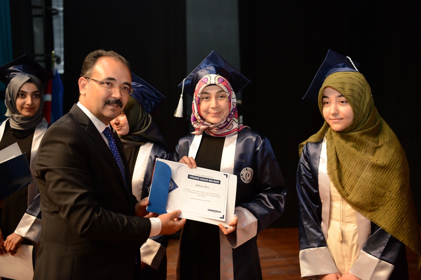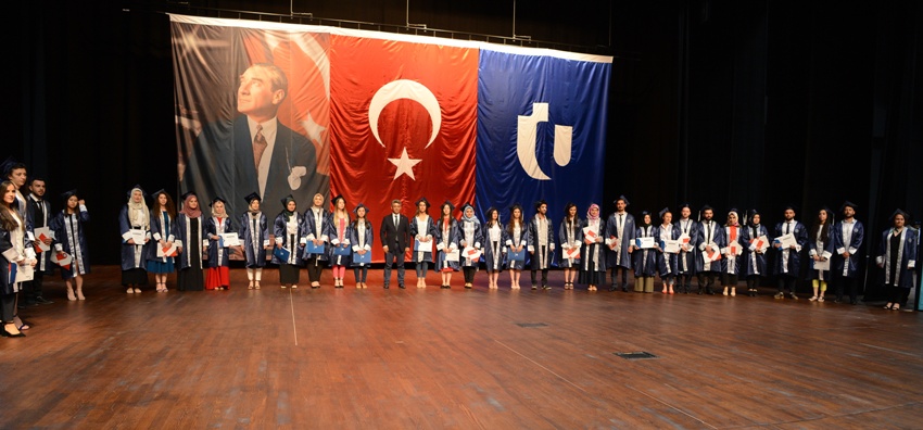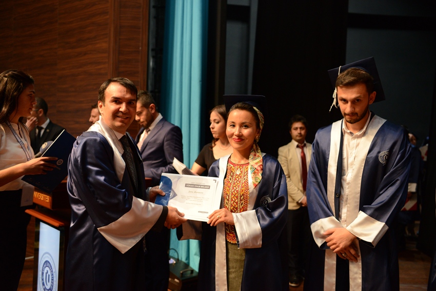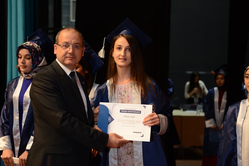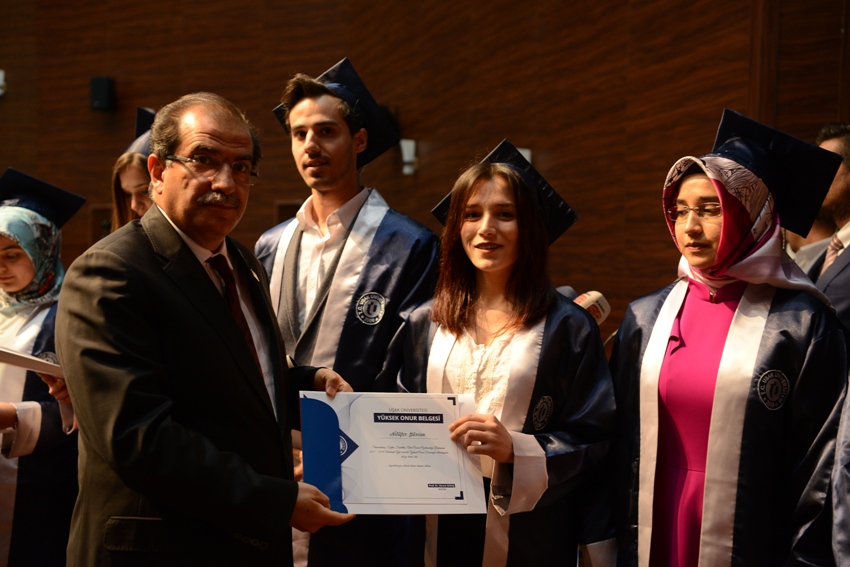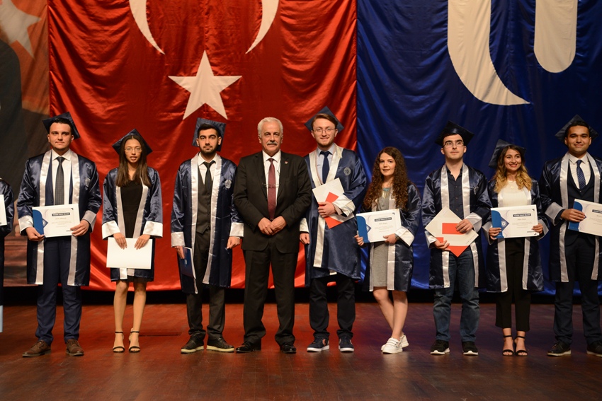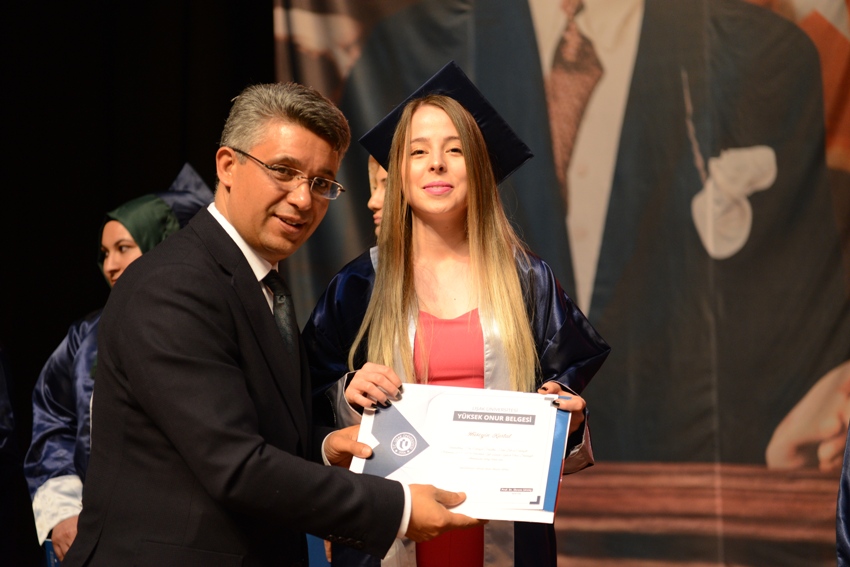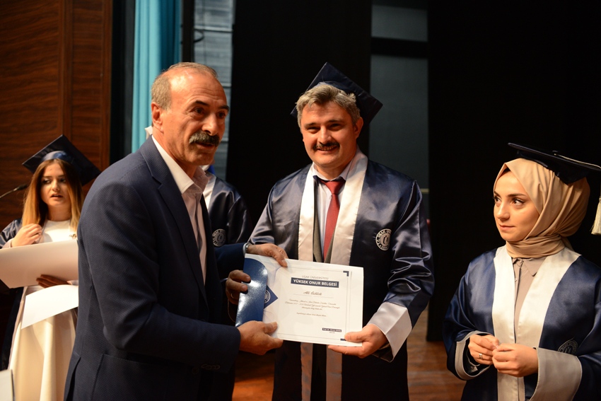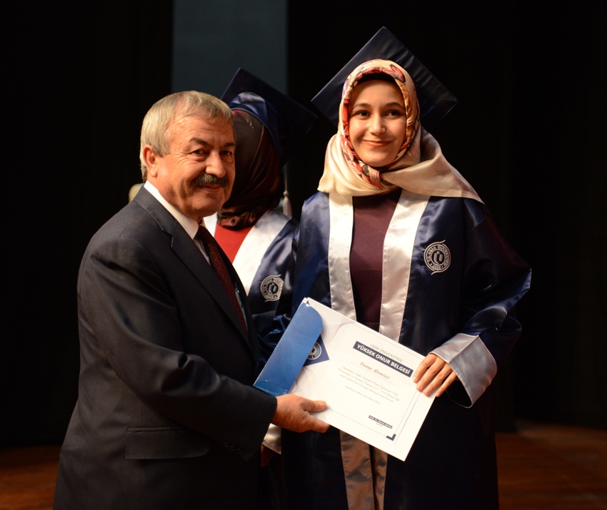 Saygı Duruşu ve İstiklal Marşı’nın okunması ile başlayan tören, onur belgesi almaya hak kazanan mezun öğrenciler adına, Uygulamalı Bilimler Yüksekokulu öğrencisi Emine Üzüm’ün konuşmasıyla devam etti. Emine Üzüm, bugün çağ açıp çağ kapayan necip bir milletin, üniversite mezunu evlatları olarak, 2023, 2053 ve 2071 hedeflerini gerçekleştirebilmek için Milli Mücadele Ruhuyla bir yola çıktıklarını ve bu yolda hiç durmadan azimle çalışmaya devam edeceklerini söyledi. Üzüm ayrıca, üniversite hayatları boyunca huzurlu ve güvenli şekilde öğrenim görmelerini sağlayan, başta Üniversite yönetimine ve hocalarına, İl bürokratlarına, bugünlere gelmelerinde emek ve desteklerini hiçbir zaman esirgemeyen ailelerine, arkadaşları adına teşekkür etti.