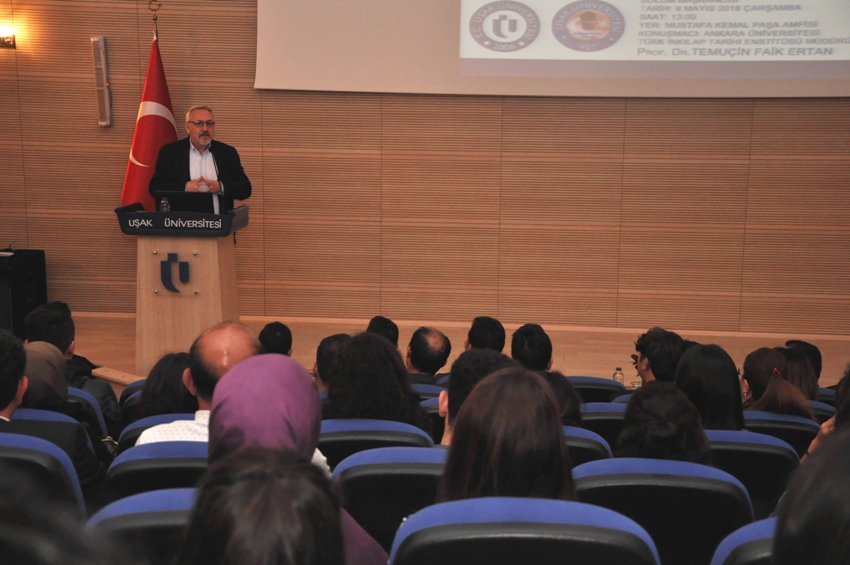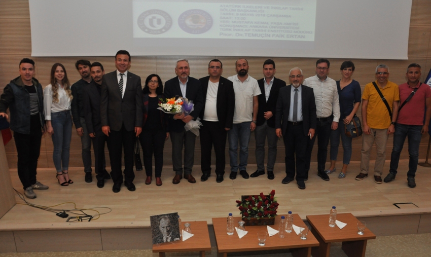 Üniversitemiz Mustafa Kemal Paşa Amfisinde, Ankara Üniversitesi Türk İnkılap Tarihi Enstitüsü Müdürü Prof. Dr. Temuçin Faik Ertan tarafından verilen konferansa, İktisadi ve İdari Bilimler Fakültesi Dekanı Prof. Dr. Sadiye Tutsak, Atatürk İlkeleri ve İnkılap Tarihi Bölüm Başkanı Doç. Dr. Barış Metin, davetliler, akademisyenler ve öğrenciler katıldı.