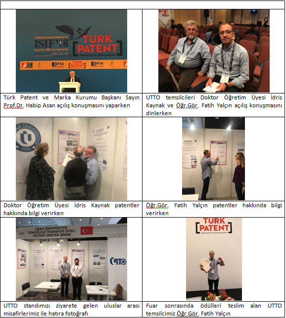 Uşak Üniversitesi Teknoloji Transfer Ofisi tarafından ISIF’18’de Uşak Üniversitesi akademisyenlerine ait patentler sergilenerek, bu buluşların ulusal ve uluslararası katılımcılarla buluşması sağlandı. Fuarda Uşak Üniversitesi akademisyenlerinin çalışmaları, 9 patent içerisinden, 1 altın, 1 gümüş ve 3 bronz olmak üzere 5 ödüle layık görüldü.
