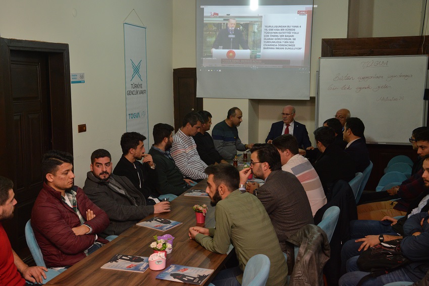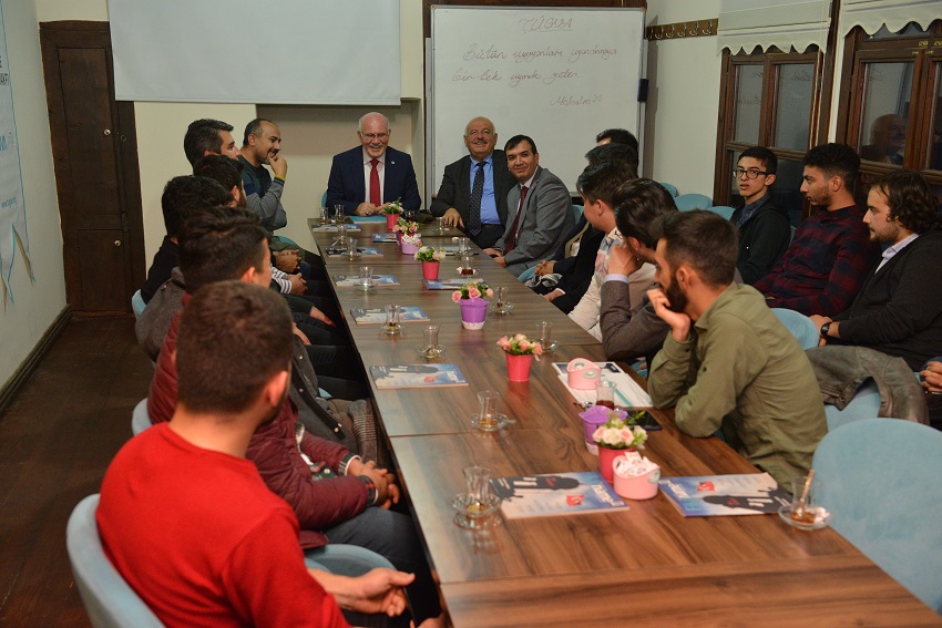 TÜGVA Uşak İl Temsilcisi Bilal Ertaş ve yönetim kurulu üyeleri tarafından karşılanan Prof. Dr. Savaş, gençlerle bir süre sohbet etti.