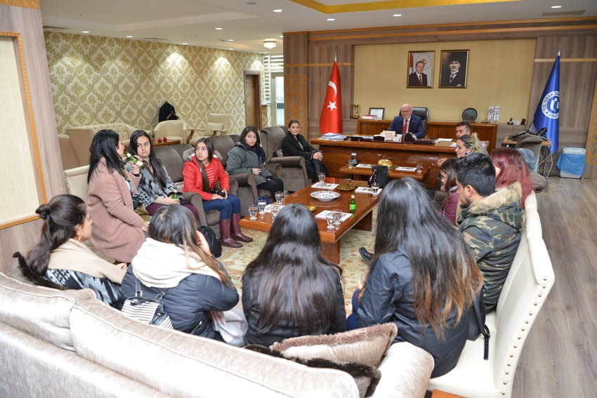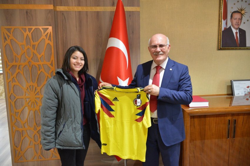 Externado Üniversitesi öğrencileri Rektör Savaş’a çalışmalarında başarılar dileyerek, ülkelerinin formasını hediye etti. Prof. Dr. Savaş ise öğrencilere çeşitli hediyeler verdi.