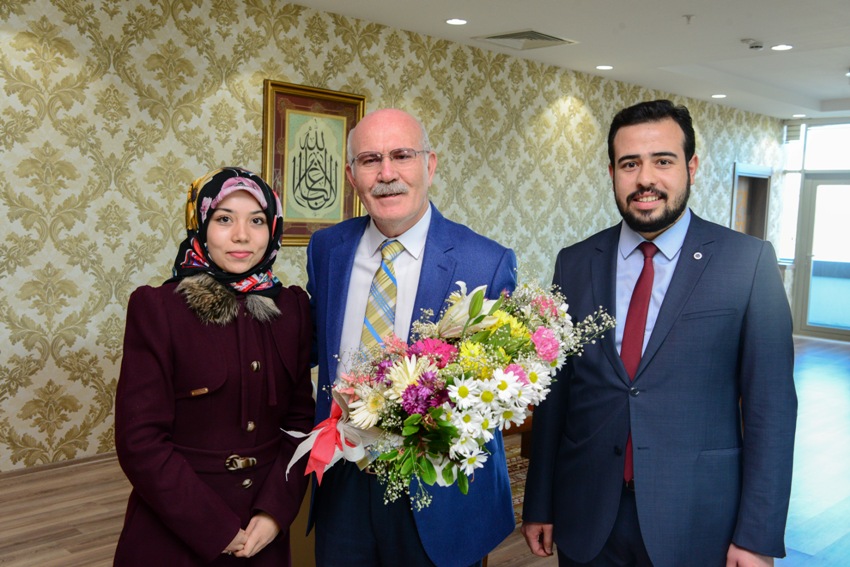 Ziyarette, Öğrenci Konsey Başkanı Taha Koyuncu ve yönetim kurulunda bulunan öğrencilerimiz Rektörümüz Prof. Dr. Ekrem Savaş’a çiçek takdim ederek hayırlı olsun temennisinde bulundular.