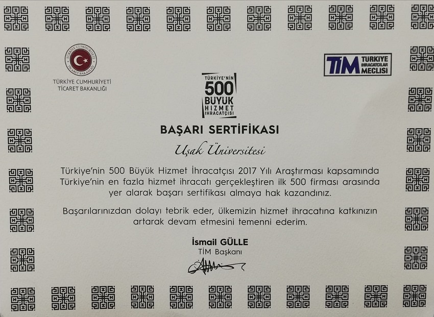 Türkiye İhracatçılar Meclisi (TİM) tarafından üçüncü kez düzenlenen, Türkiye’nin 500 büyük hizmet ihracatçısı ödüllendirildi. Uşak Üniversitesi ilk defa yer aldığı hizmet ihracatı verilerine göre büyük başarı elde ederek, devlet üniversiteleri sıralamasında 5’inci sırada, araştırmaya katılan tüm firmalar arasında 409’uncu sırada yer aldı.