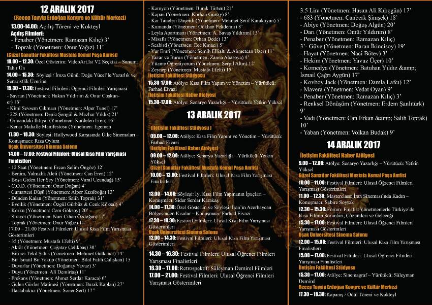 Farhad Eivazi’nin söyleşisiyle İran’ın Azerbaycan bölgesinden 10 kısa filmin yanı sıra Tahir Ün’ün sunumuyla uluslararası video art seçkisi VideoArt.Ist V2 özel gösterimlerinin, yazarlık ve kısa film üzerine söyleşilerin, yapım/yönetim, senaryo yazarlığı ve sinemagraf üzerine atölyelerin, İran sinemasına dair masterclassın yer alacağı programda ayrıca geçtiğimiz yıl olduğu gibi finalist sanatçıların söz alacağı kısa film yönetmenleri forumu düzenlenecek. Ön elemeyi geçen filmlerin tamamına sembolik telif ödeyerek bu noktada Türkiye’de bir ilki gerçekleştiren 4. Uşak Kanatlı Denizatı Kısa Film Festivali’nin finalist listesi ve ayrıntılı programı ise şu şekilde;