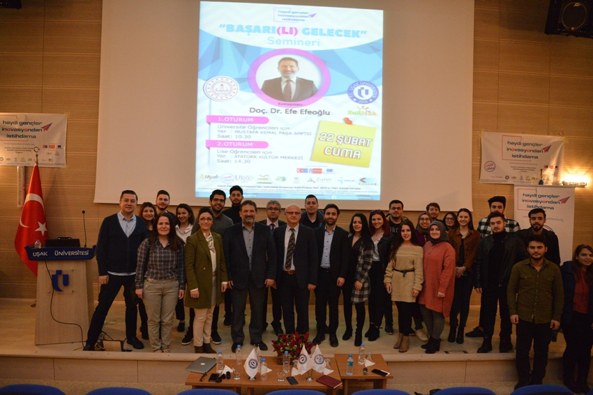 Uşak Üniversitesi ile Uşak İl Milli Eğitim Müdürlüğü ortaklığında yürütülen, “Haydi Gençler İnovasyon’dan İstihdama” adlı Erasmus+ KA3 projesi kapsamında düzenlenen “Başarı(lı) Gelecek" semineri, 22 Şubat tarihinde Adana Bilim ve Teknoloji Üniversitesi Öğretim Üyesi Doç. Dr. Efe Efeoğlu'nun konuşmacı olarak katıldığı programla gerçekleştirildi.