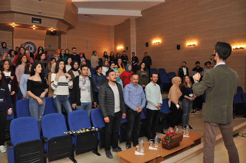 Mustafa Kemal Paşa Amfisinde gerçekleşen etkinlikte Uğur Böcekleri Derneğinden Batuhan Kürkçü, öğrencilere tavsiyelerde bulunarak, yurt sevgisi, girişimcilik, iş kalitesi, dürüstlük, hoşgörü gibi değerleri örneklerle anlattı. İletişim tekniklerini uygulamalı olarak aktaran Kürkçü “İyilik yap karşılık bekleme, bilgiyi paylaş karşılık bekleme.”dedi.