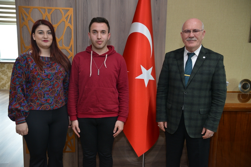 Rektör Prof. Dr. Ekrem Savaş, Kaynama Noktası /Impatience filminin Yönetmeni Uşak Üniversitesi İletişim Fakültesi Radyo Televizyon ve Sinema bölümü öğrencisi Onur Ulucanlı ve Yönetmen Asistanı Gamze Akıncı'yı makamında kabul etti.