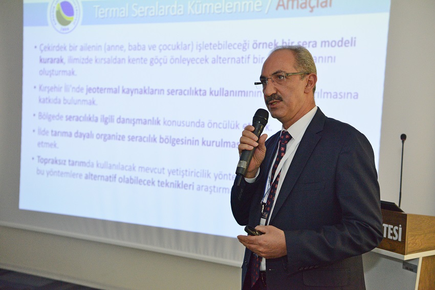 Uşak Üniversitesi sunumunun ardından, Tarım ve Jeotermal alanlarında ihtisaslaşan, Kırşehir Ahi Evran Üniversitesi’nin çalışmaları ve projeleri hakkında Rektör Karakaya bilgi verdi. Prof. Dr. Karakaya sunumunda, TR 71 Bölgesinde yer alan Kırşehir’in, tarım ve hayvancılık üretiminde elverişli bir coğrafyada bulunduğunu ve jeotermal kaynak potansiyeline sahip olduğunu belirtti. Bölgenin iklim koşullarına uygun yem bitkilerinin üretilmesi, jeotermal kaynaklarının da özellikle sağlık sektöründe kullanımına yönelik projeler yaptıklarını dile getirdi. Rektör Karakaya, termal sera, kaba yem, ceviz odaklı kalkınma ve gelişim, jeotermal kaynaklı rehabilitasyon merkezi, geleneksel ve tamamlayıcı tıp, sporcu sağlığı araştırma uygulama ve termal rehabilitasyon merkezi projeleri hakkında bilgi verdi.