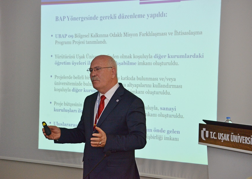 DTS İhtisaslaşma Modelini anlatan Prof. Dr. Savaş, Uşak Valiliği, Uşak Belediyesi, bölge sanayicileri, Zafer Kalkınma Ajansı ve üniversite birimlerinin bu modeldeki önemine dikkat çekti. Prof. Dr. Savaş, özellikle Bilimsel Araştırma Projeleri (BAP) yönergesindeki yaptıkları değişikliklerle çalışmalarının daha hızlı ilerlediğini söyledi. DTS alanlarında proje çağrısına çıktıklarını, değerlendirme aşamasının ardından deri alanında, “İnovatif Deri Ürünleri Tasarımı ve Prototip Geliştirme Projesi” ve “Türkiye’deki Tarımsal Atıkların Değerlendirilmesi İle Yüksek Saflıkta Formik Asit Üretim Yönteminin Geliştirilmesi ve Muhtemel Pilot Üretim Tesisisin Tasarım ve Simülasyonu” adlı projelerin, tekstil alanında “Yüksek Mukavemetli ve Hafif Aradolgulu Kumaş Kompozitler İçin En Uygun Hibrid İplik Tasarımlarının Geliştirilmesi”, “Oturma Davranışlarının İncelenmesine Yönelik Akıllı Koltuk Kılıfı Tasarımı” ve “Düşük Maliyetli İplik Düzgünsüzlük Test Cihazı Tasarımı” projelerinin, seramik alanında ise “Seramik Kaplama Endüstrisine Yönelik Dijital Tasarım ve Prototip Geliştirme” adlı projenin desteklenmekte olduğunu belirtti.