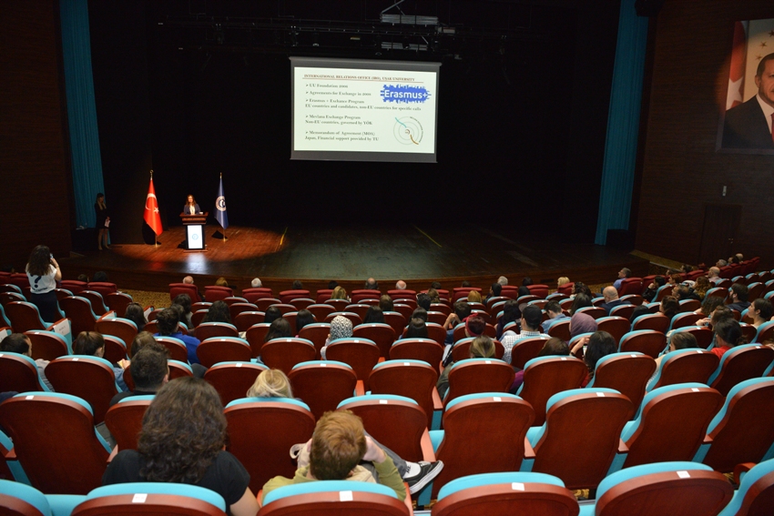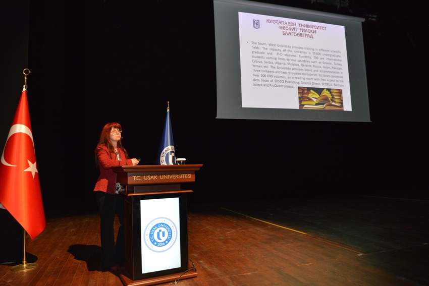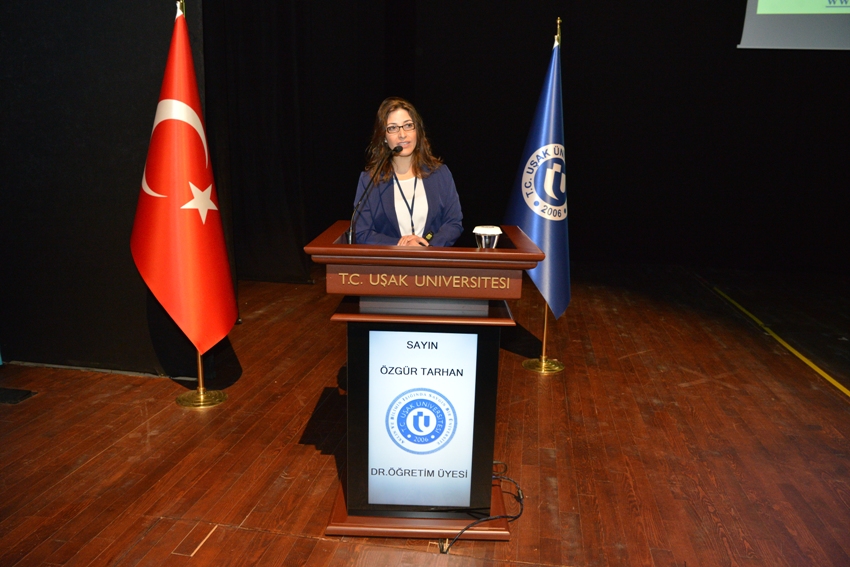 Uşak Üniversitesi AB ve Uluslararası İlişkiler Ofisi Koordinatörü Dr. Öğr. Üyesi Özgür Tarhan, yaptığı konuşmada uluslararası değişim programlarını tanıtan bir sunum yaptı.