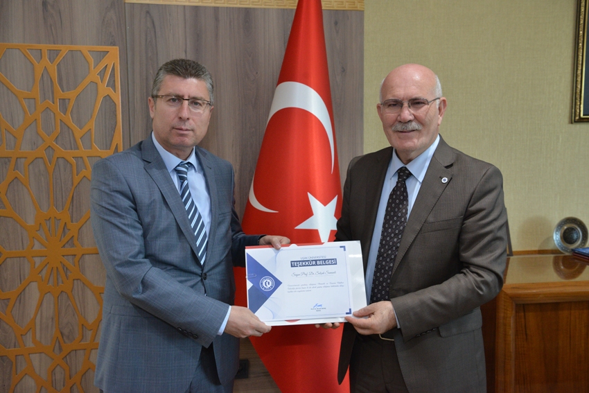 Rektör Prof. Dr. Ekrem Savaş görevini başarıyla ifa eden Prof. Dr. Samanlı’ya teşekkür belgesi takdim ederek, bugüne kadar yaptığı çalışmalardan dolayı teşekkür etti.