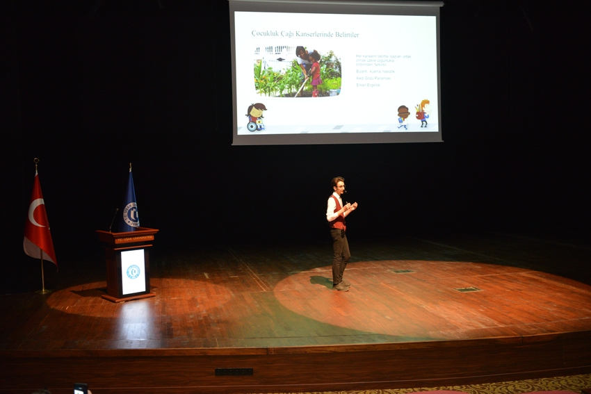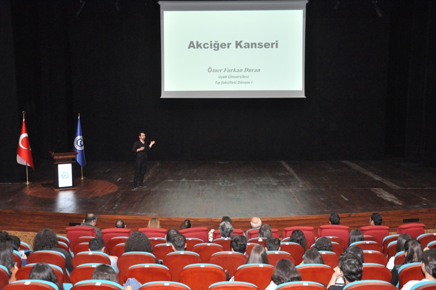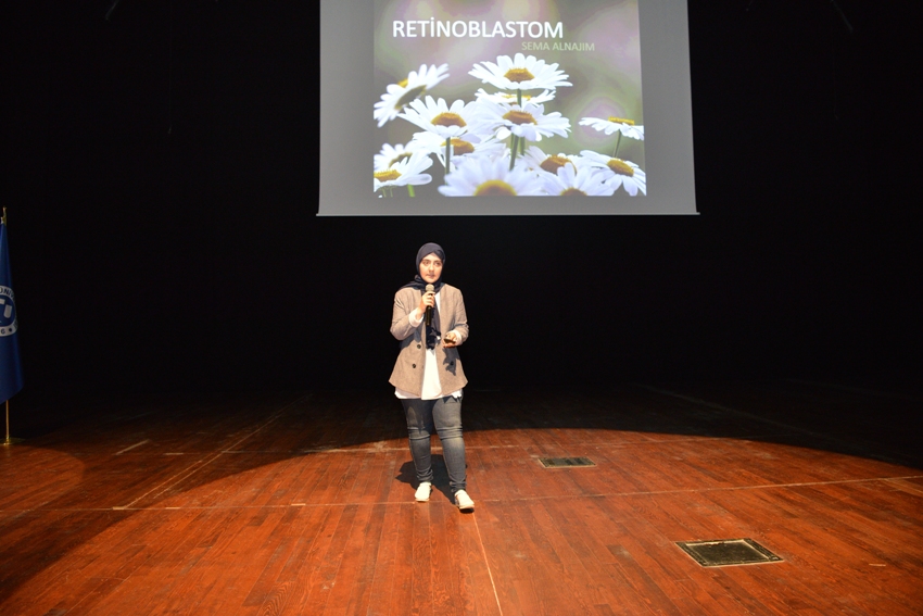Programın ilk bölümünde Tıp Fakültesi 2018-2019 Dönem 1 öğrencilerinden Özge Bağcı ve Ecem Erbaş “Kanser Hastalarına Psikiyatrik Yaklaşım”, Ömer Furkan Duran “Akciğer Kanseri”, Nigar Mercan ve Edanur Erer “Rahim Kanseri” sunumlarını gerçekleştirdiler. Poster sunumlarının ardından, programın ikinci bölümünde Abdullah Üskün “Çocukluk Çağı Kanserleri”, Hasret Akgül “Lösemi”, Mehmet Anıl “Beyin Kanseri”, Sema Aljanim “Göz Kanseri” ve Senanur Koçoğlu “Mide Kanseri” sunumunu gerçekleştirdi.