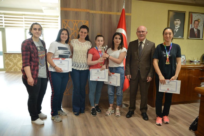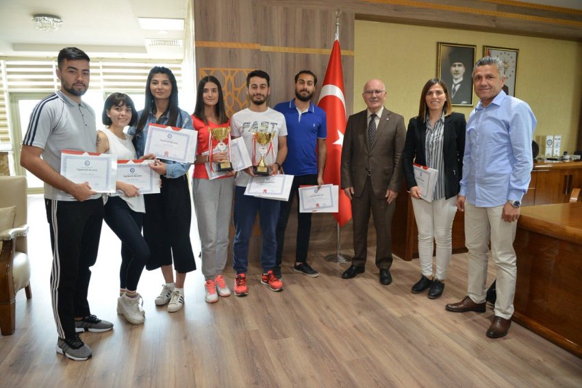 Antalya, Kemer'de 24 - 26 Şubat tarihleri arasında düzenlenen "Bilek Güreşi Türkiye Şampiyonası" ile 5 - 8 Mart tarihlerinde Antalya-Serik ilçesinde düzenlenen "Tenis 2. Lig" inde dereceye giren sporcularımıza Rektörümüz Prof. Dr. Ekrem Savaş, teşekkür belgelerini takdim ederek başarılarının devamını diledi.