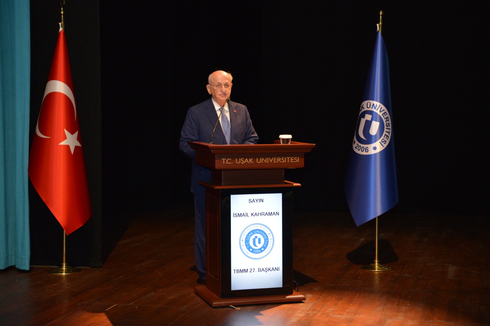 Uşak Üniversitesi tarafından 15 Temmuz Demokrasi ve Milli Birlik Günü kapsamında, TBMM 27. Başkanı İsmail Kahraman’ın katılımıyla, “Türkiye’de Darbeler Tarihi ve 15 Temmuz” konulu konferans gerçekleştirildi. Recep Tayyip Erdoğan Kongre ve Kültür Merkezinde gerçekleştirilen konferansa, Uşak Valisi Funda Kocabıyık, Belediye Başkanı Mehmet Çakın, Başsavcı V. Cumhuriyet Savcısı Sinan Ok, Adalet Komisyon Başkanı V. 3. Ağır Ceza Mahkemesi Başkanı İsmail Gülenç, Uşak Üniversitesi Rektörü Prof. Dr. Ekrem Savaş, protokol üyeleri, akademisyenler, idari personel ve çok sayıda vatandaş katıldı. Program, saygı duruşu ve İstiklal Marşı’nın okunmasın ardından, İslami İlimler Fakültesi Öğretim Görevlisi İbrahim Gezer’in Kur’an-ı Kerim tilaveti ile başladı.