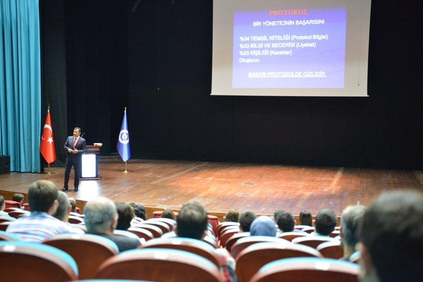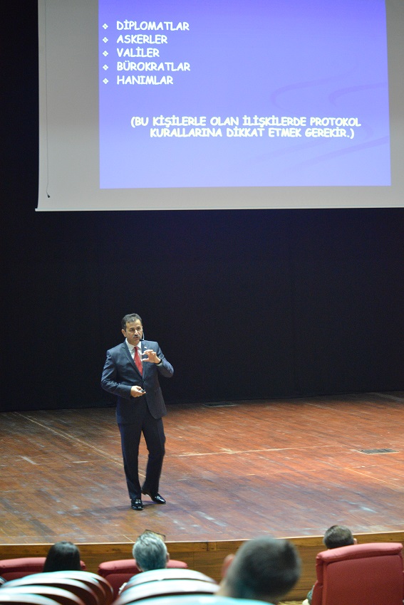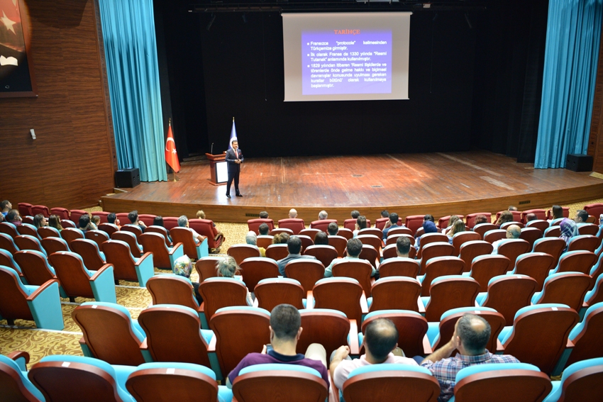 Recep Tayyip Erdoğan Kongre ve Kültür Merkezinde düzenlenen eğitim Genel Sekreter İbrahim Çalış tarafından verildi. Resmi protokol kurallarının tarihçesi, protokol türleri ve protokol kurallarının esasları, protokolde beden dili, makamda ast/üst ilişkileri ve davranış kuralları, tören ve toplantılarda protokol kuralları, resmi yazışmalarda protokolün esasları hakkında personele bilgi verdi. İyi bir yöneticinin başarısının yüzde 34 temsil yeteneğine, yüzde 33 bilgi ve beceriye ve yüzde 33 kişiliğe bağlı olduğuna dikkat çeken Çalış, protokol kurallarını bilmenin ve uygulamanın kişileri diğer insanlardan farklı, özel, seçkin ve aranılan insan yapacağını belirtti. Protokol bilgisine sahip olmanın kişinin özgüvenini de artacağını sözlerine ekledi.