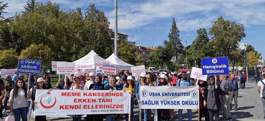 Uşak Üniversitesi Sağlık Yüksekokulu, Sağlık Hizmetleri Eğitim Uygulama ve Araştırma Merkezi ve Uşak İl Sağlık Müdürlüğü, 1-31 Ekim Meme Kanseri Farkındalık Ayı etkinlikleri kapsamında, 10 Ekim tarihinde Uşak Sağlık Yüksekokulu Hemşirelik bölümü öğrencileri ile birlikte 'Meme Kanseri Farkındalık Yürüyüşü' gerçekleştirdi.