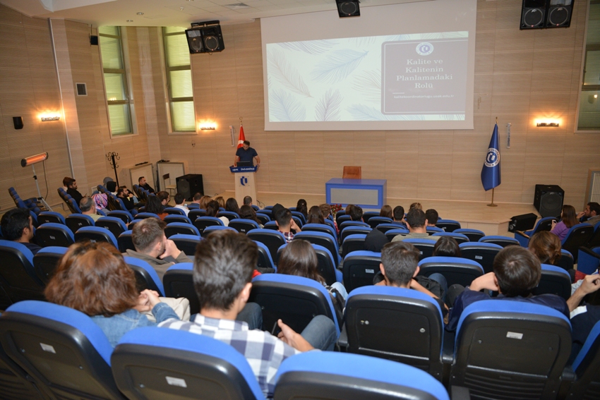 Dr. Öğr. Üyesi Aydın, kalite ve kalitenin planlamadaki rolünden bahsettiği konuşmasında Uşak Üniversitesi Kalite Koordinatörlüğünün çalışmaları hakkında bilgi vererek "Biz bütün çalışmalarımızı öncellikli olarak öğrencilerimiz ve çalışma arkadaşlarımızın görüşlerini dikkate alarak gerçekleştiriyoruz. Üniversitemizin web sayfasında bulunan Kalite Koordinatörlüğü birimine ait öneri sistemi üzerinden gelen bildirimleri dikkate alarak kaliteyi arttırmaya yönelik çalışmalarda bulunuyoruz. Bu bağlamda siz öğrencilerimiz ve çalışma arkadaşlarımızın bu sistem üzerinden önerilerinizi bekliyoruz." dedi.