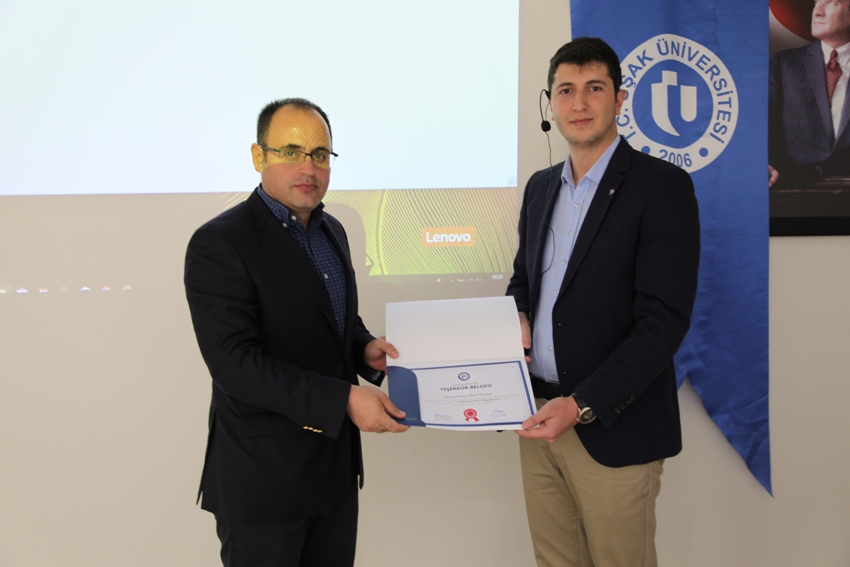 Etkinlik, soruların cevaplanmasının ardından Uşak Üniversitesi TTO Koordinatörü Doç. Dr. Yılmaz Bayar’ın, TÜBİTAK SOBAG Uzman Yardımcısı Serkan Fatih Orakçı’ya teşekkür belgesi vermesi ile son buldu.