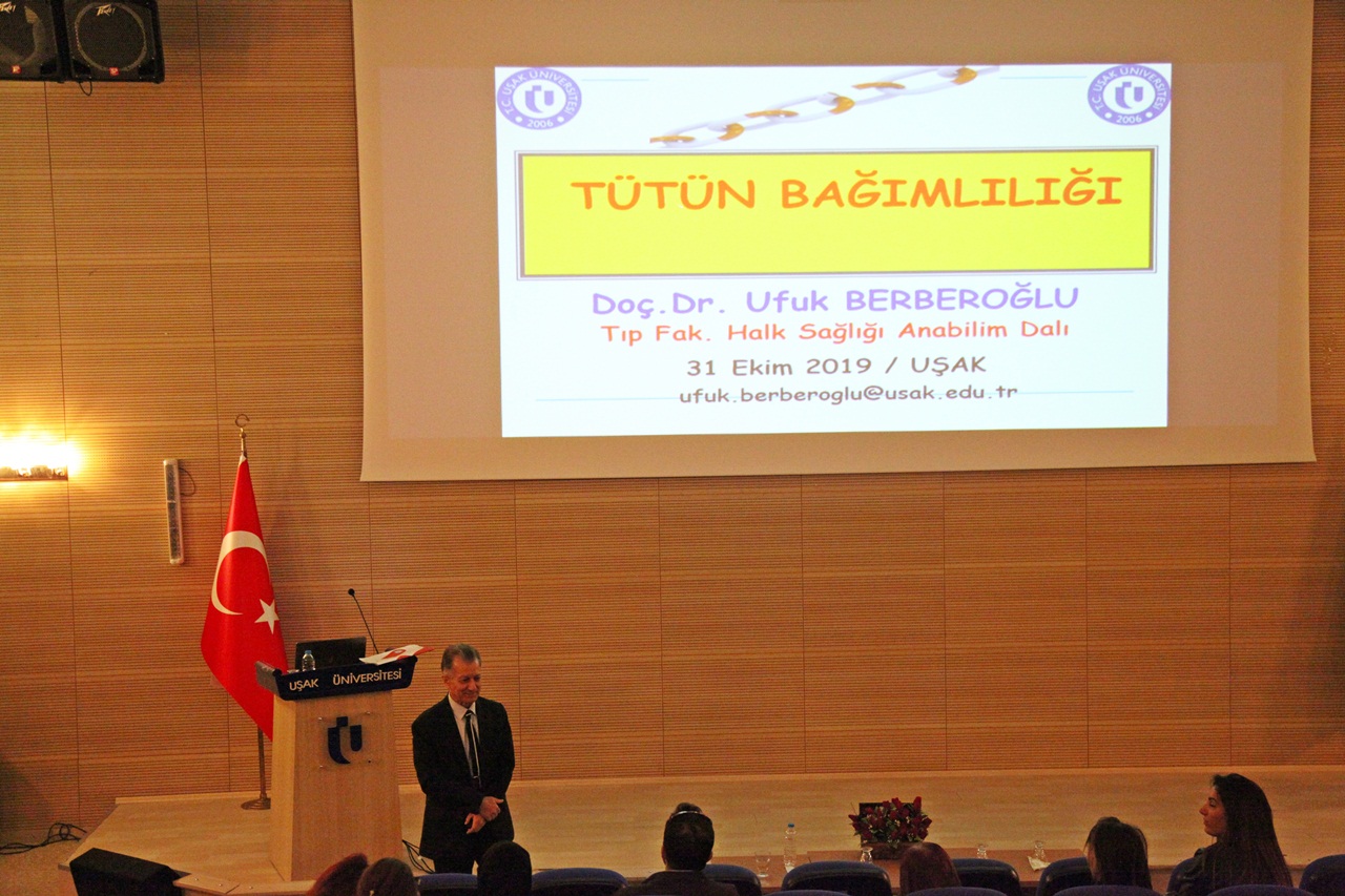 Uşak Üniversitesi Personel Daire Başkanlığı “Hizmet İçi Eğitim Programı” çerçevesinde, "Sigara Bağımlığı" konulu eğitim verildi. Hizmet İçi Eğitim Şubesi tarafından Mustafa Kemal Paşa Amfisinde düzenlenen eğitime, Tıp Fakültesi Öğretim Üyesi Doç. Dr. Ufuk Berberoğlu konuşmacı olarak katılarak, dünyada yaşanan tütün ürünleri tüketiminin artışı ve tütün kullanımının zararları konularında bilgiler verdi.