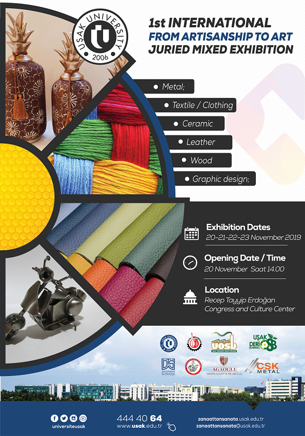 Uşak Üniversitesi Recep Tayyip Erdoğan Kongre ve Kültür Merkezinde, Uşak Belediyesi'nin katkılarıyla 20 Kasım saat 14.00’te açılışı yapılacak olan “I. Uluslararası Zanaattan Sanata Jürili Karma Sergisi”, 20-23 Kasım halka açık olarak ücretsiz gezilebilecek.