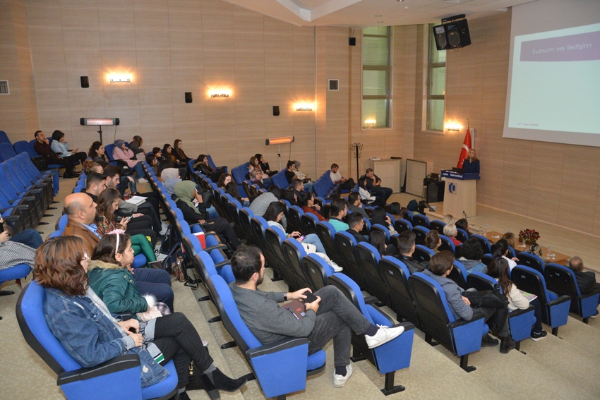 Tıp Fakültesi Öğr. Gör. Prof. Dr. Figen Ayhan konferansta, etkili sunum teknikleri, sunuma hazırlık, sunum anı ve sunum sonrası yapılması gerekenler hakkında bilgi verdi. Ayhan, etkili bir akademik sunumun gerekliliklerinden ve dinleyicileri etkilemenin püf noktalarından bahsetti.