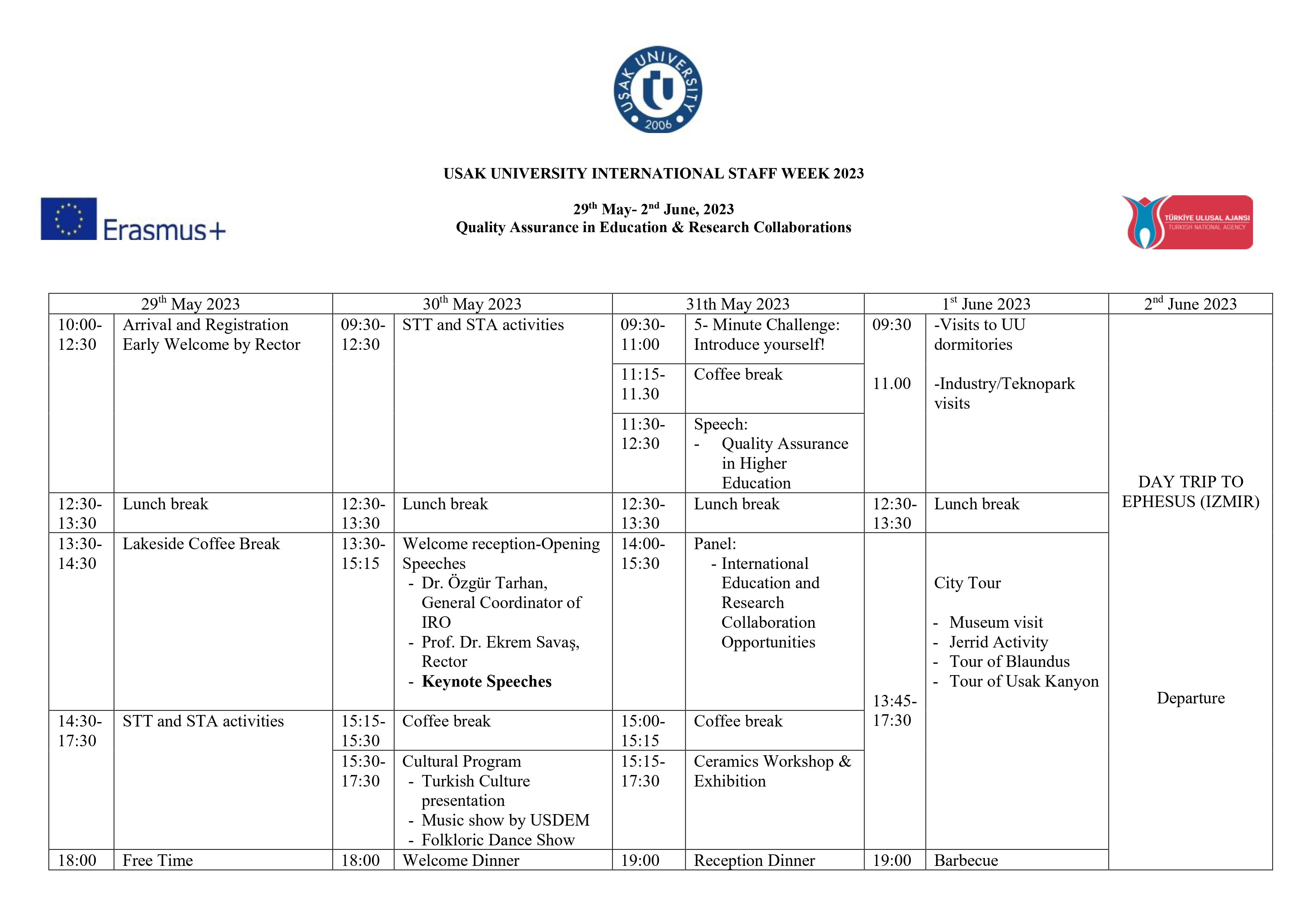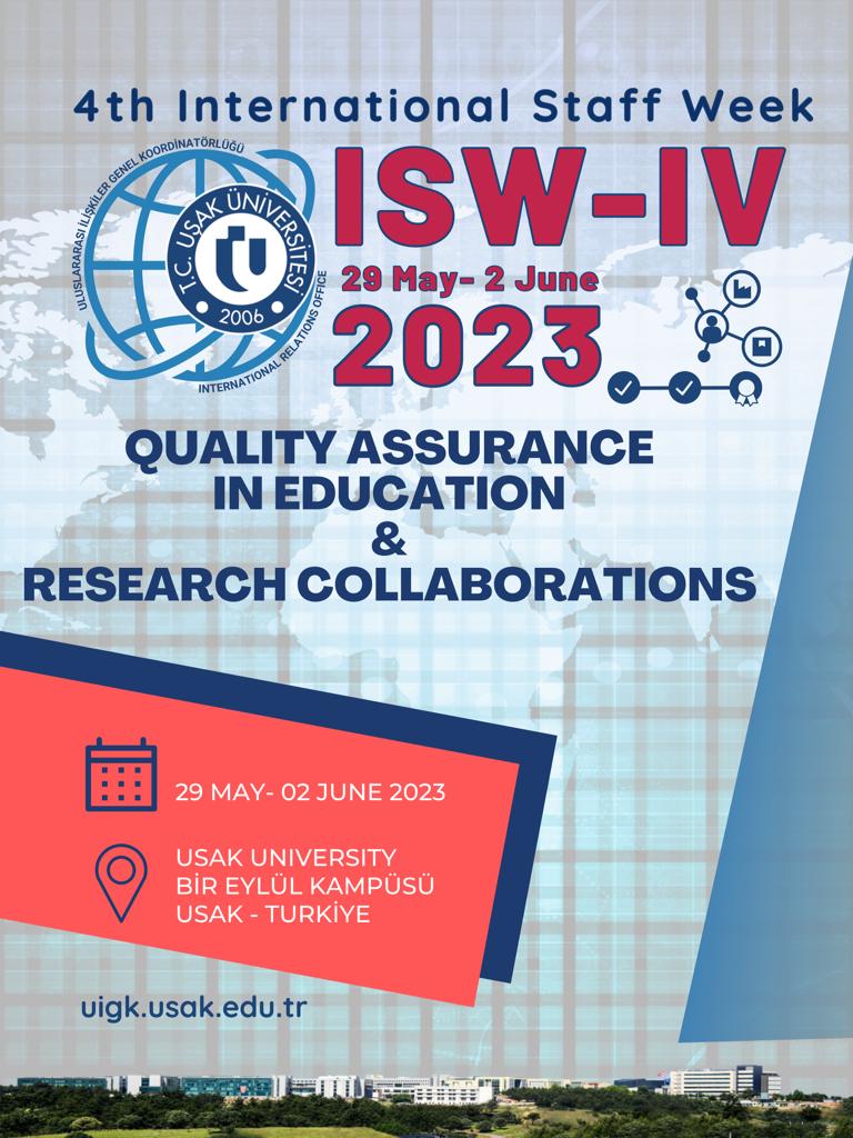 Genel Koordinatörlüğümüz bünyesinde gerçekleştirilen ve artık geleneksel hale gelen Uşak Üniversitesi Uluslararası Hafta (International Staff Week) etkinliğinin 4.'sü bu yıl "Quality Assurance in Education & Research Collaborations" temasıyla 29 Mayıs 2023 - 02 Haziran 2023 tarihlerinde gerçekleştirilecektir. Her yıl olduğu gibi bu yıl da bütün uluslararası ortaklarımız etkinliğimize davet edilmiştir.